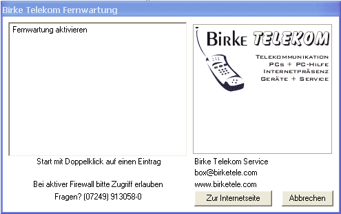 Laden Sie sich ein kleines Programm (birkekom.exe) herunter und starten Sie es. Sie ermöglichen mir damit, Ihren Bildschirm zu sehen und zu steuern, so dass ich Ihr Problem direkt lösen kann. Der Ablauf ist wie folgt: